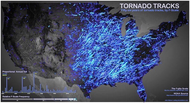 John Nelson adında bir ABD'li, 56 yıllık verileri ve bilgisayarı kullanarak ABD'nin 56 yıllık kasırga geçmişi haritasını ortaya çıkardı. Kasırgaların geçtiği yerlerdeki yoğunluk derecesinin renklendirme ile belirtildiği bu başarılı çalışma için Nelson, bizdeki İstatistik Enstitüsü benzeri bir kurum olan Data.gov verilerinden yararlanılmış.